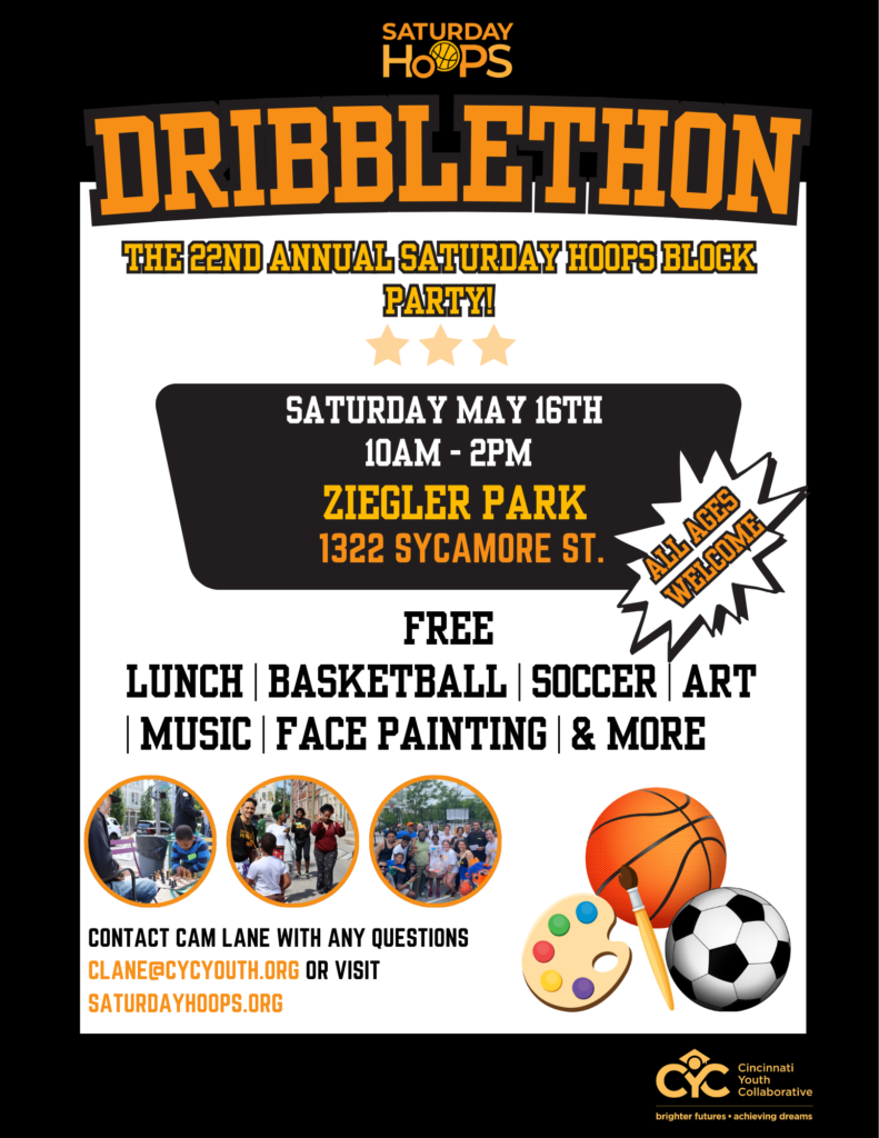 We’re excited to announce the details for our 22nd Annual Dribblethon! Save the date and join us on May 16th as we “tipoff” for our 22nd summer in Over The Rhine. We’ll have games, music and free food for all ages!
